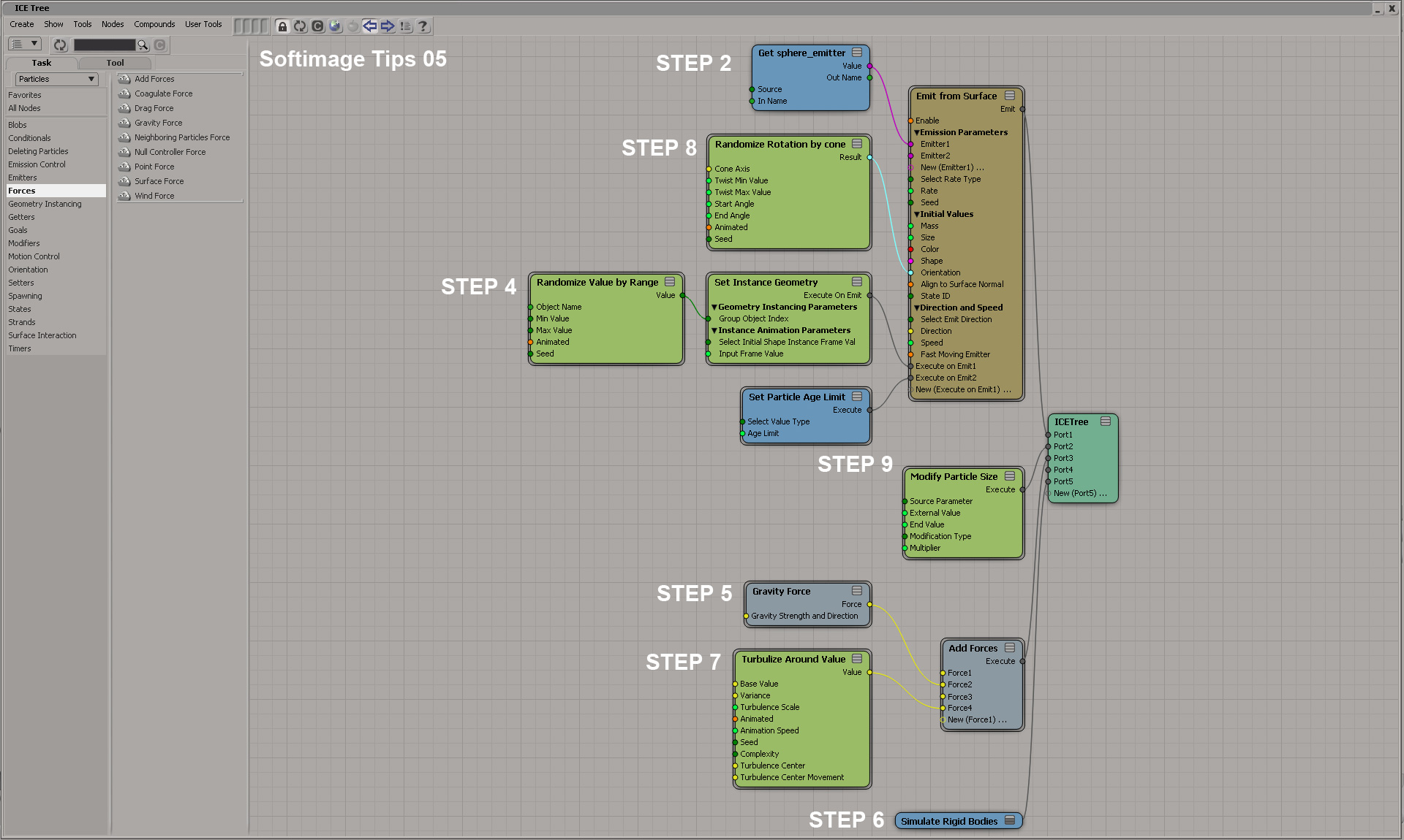 ※「Simulate Particle」ノードを最後のポートにつなぎかえます。