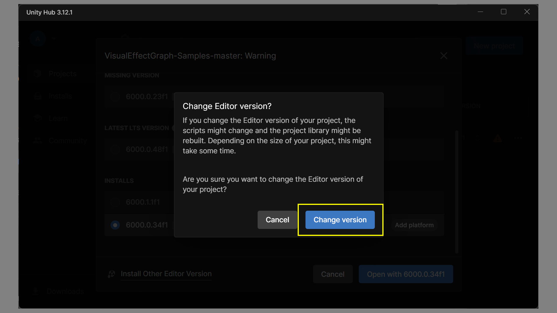 | エディターのバージョンを変更しますか? プロジェクトのエディターバージョンを変更すると、スクリプトが変更されたり、プロジェクトライブラリが再構築されたりする可能性があります。プロジェクトのサイズによっては、処理に時間がかかることがあります。 本当にプロジェクトのエディターバージョンを変更しますか? |