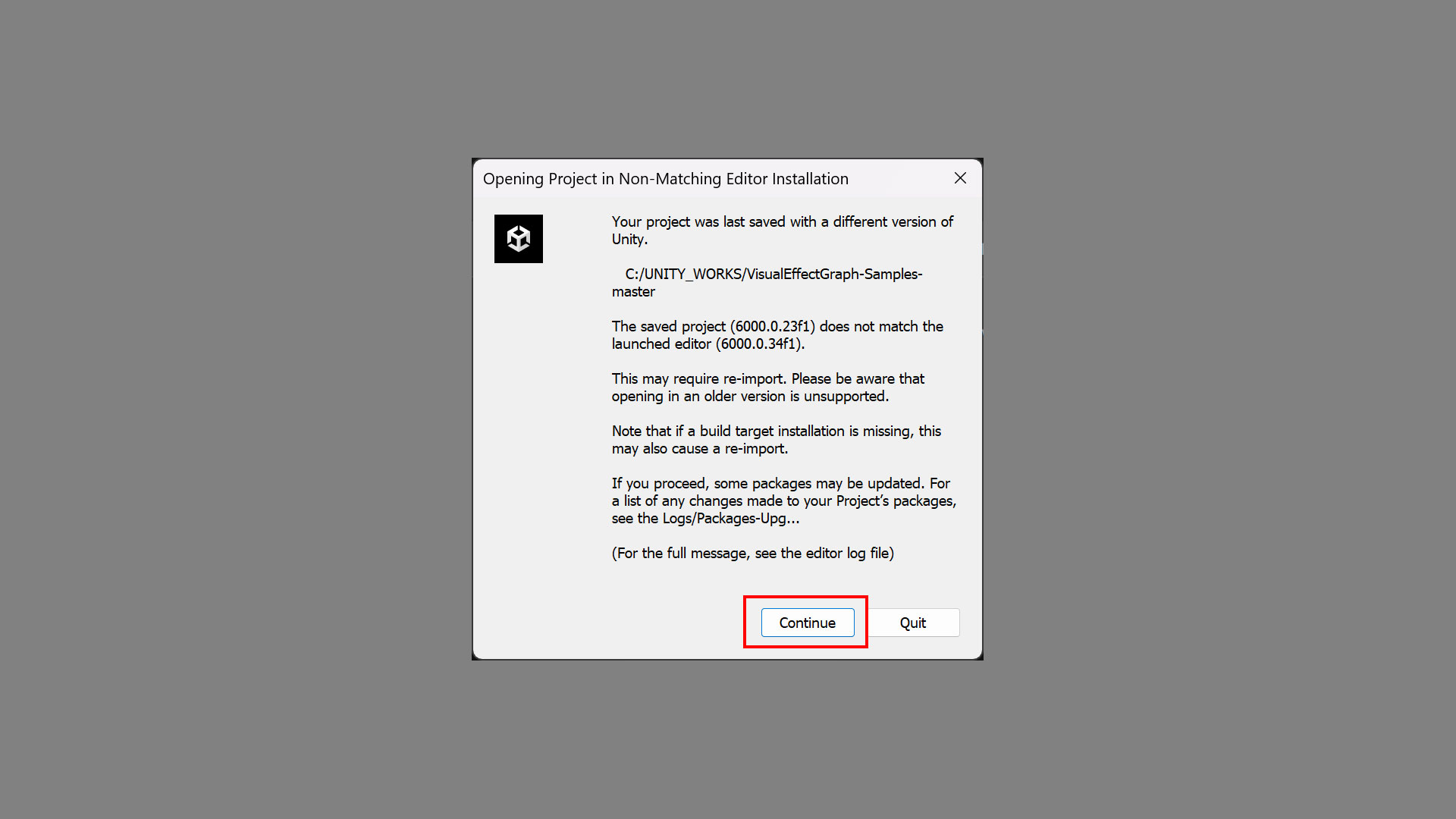 | あなたのプロジェクトは、異なるバージョンの Unity で最後に保存されました。 C:/UNITY_WORKS/VisualEffectGraph-Samples-master 保存されたプロジェクト(6000.0.23f1)は、起動したエディターのバージョン(6000.0.34f1)と一致しません。 このため、再インポートが必要になる場合があります。古いバージョンで開くことはサポートされていないのでご注意ください。 また、ビルドターゲットがインストールされていない場合も、再インポートが発生する可能性があります。 続行すると、一部のパッケージが更新されることがあります。プロジェクトのパッケージに対して加えられた変更の一覧は、Logs/Packages-Upg… を参照してください。 (全文を見るには、エディターログファイルをご確認ください) |