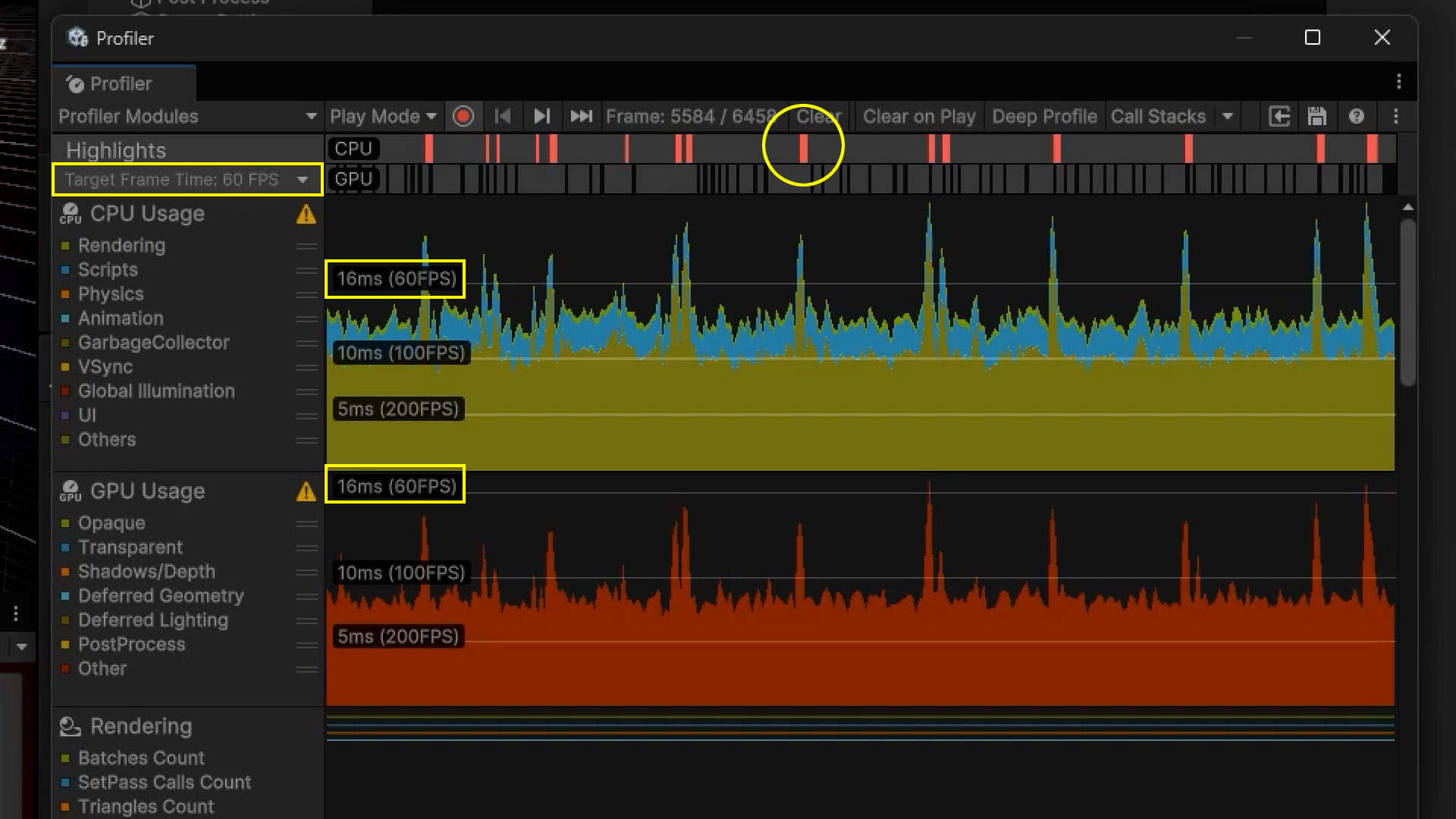 Windowメニュー > Analysis > Profiler(ショートカット Ctl +7)でProfilerウインドウを表示させて、左上部分のTargetFrameTimeを「60FPS」にした状態で、CPUとGPUのコマ落ち具合を確認します。