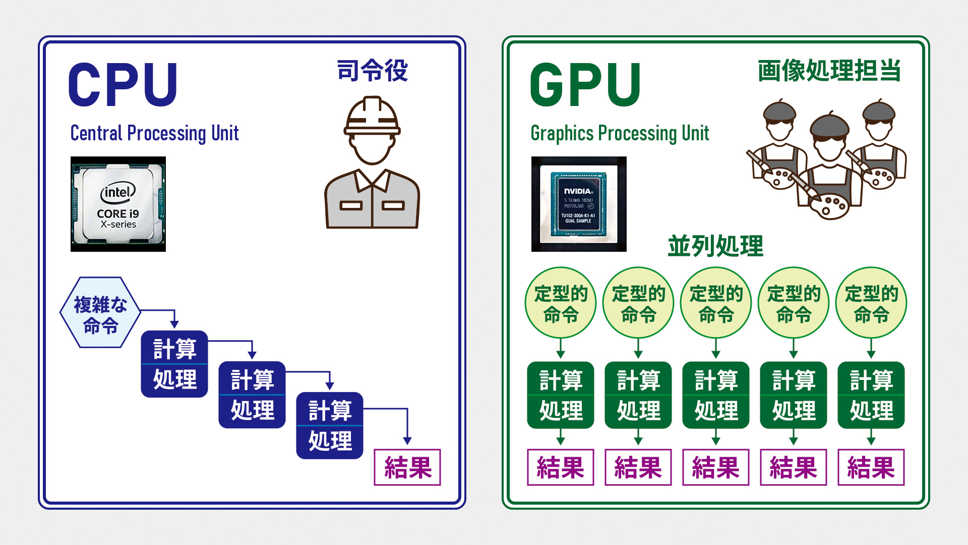 VFX-Graphで処理パフォーマンスを調整するにあたり、CPUとGPUの描画概念の違いを簡単におさらいしておきましょう。UnityのVFX-Graphを使用するには「強力なグラフィックカード(GPU)が必要だ」という話はよく聞きますが、GPUはCPUと違い「定型的な命令を並列処理することに特化」した画像処理装置だと理解すると良さそうです。この定型的な命令をVFX-Graphで定義してあげるということになります。