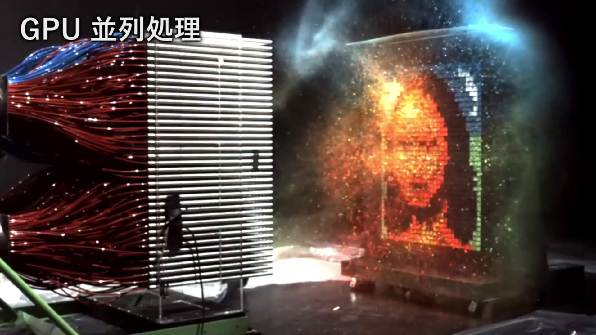 つづいてGPUが「絵を描く」様子をデモンストレーションしていきます。こちらは1100本のチューブがついた巨大な発射装置で描画します。3・2・1・ブシュー! で一瞬でモナリザの絵画風イラストが完成しました。