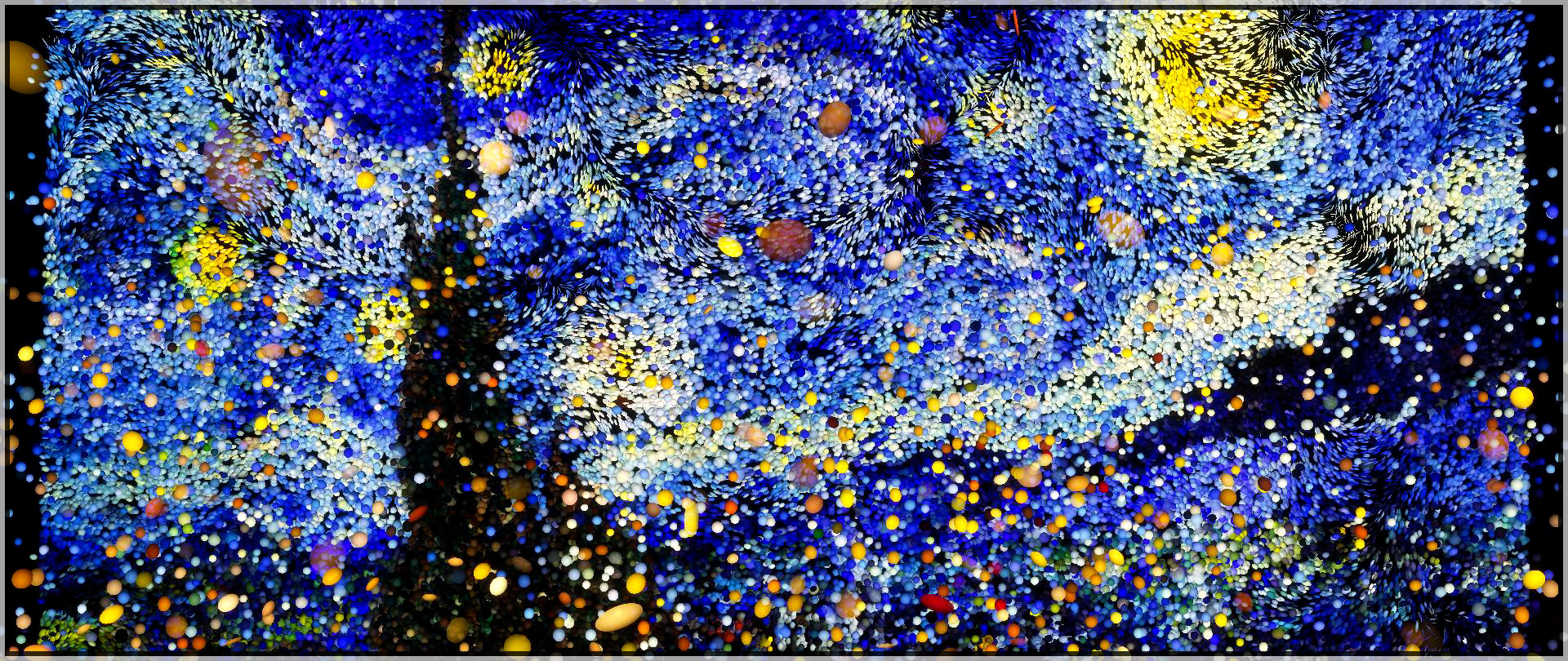 今回はパーティクルを使用した画面切り替え(トランジション)の表現です。絵画をはじめ写真や映像でも適用できると思います。粒が大きく飛び散るので大画面で実行すると迫力ありそうですね。